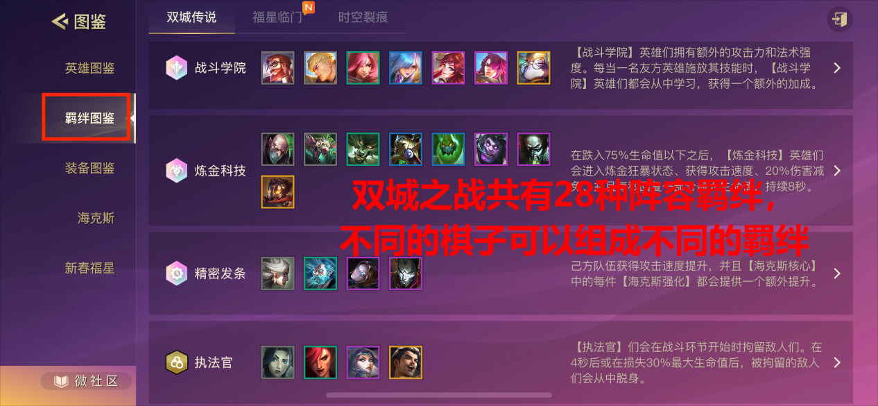 金铲铲之战中,以双城之战模式为例,在此模式中,一共有28种羁绊,且所有英雄棋子至少拥有一个羁绊或职业。当凑齐某一种羁绊或者职业,那么就会给英雄棋子提供额外的属性。不同的阵容羁绊可以提供不同的额外属性加强。
