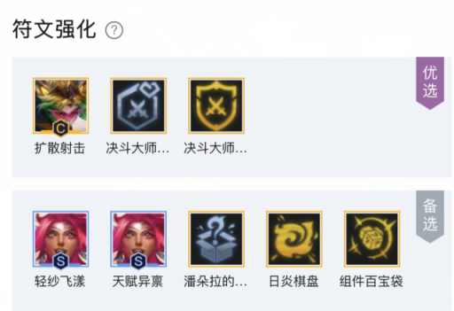 2.强化符文选择:优选扩散设计,决斗大师之心,决斗大师之徽;次选轻纱飞漾,天赋异禀,潘多拉的装备,日炎棋盘,组件百宝袋。