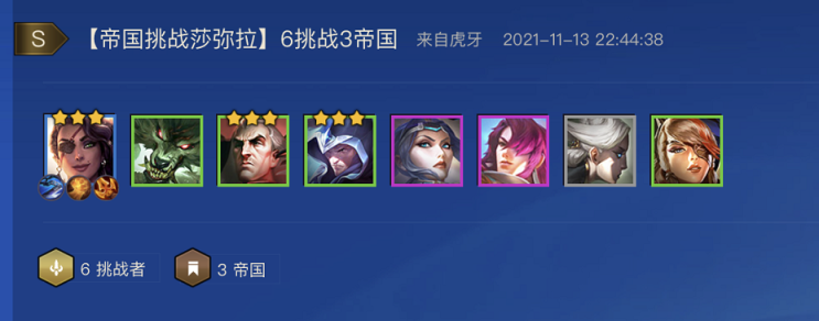 1,帝国挑战沙弥拉-六帝国三挑战,由沙弥拉,狼人,乌鸦,男刀,剑姬,永恩,青钢影,奎因组成.