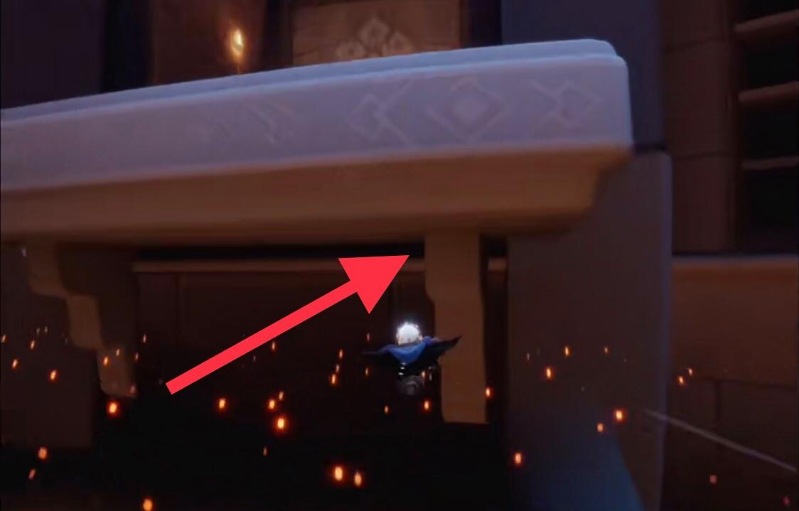 2、飞到缝隙中之后,向右走会发现右边会有一个起来的柱子边缘,使用右边键盘跳到这个柱子上。