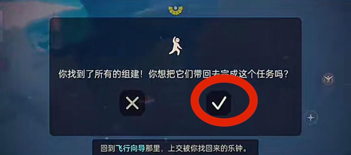 4、收集完成之后就会出现任务完成的提示,点击右下角的对号即可,这个任务就是完成通过了。