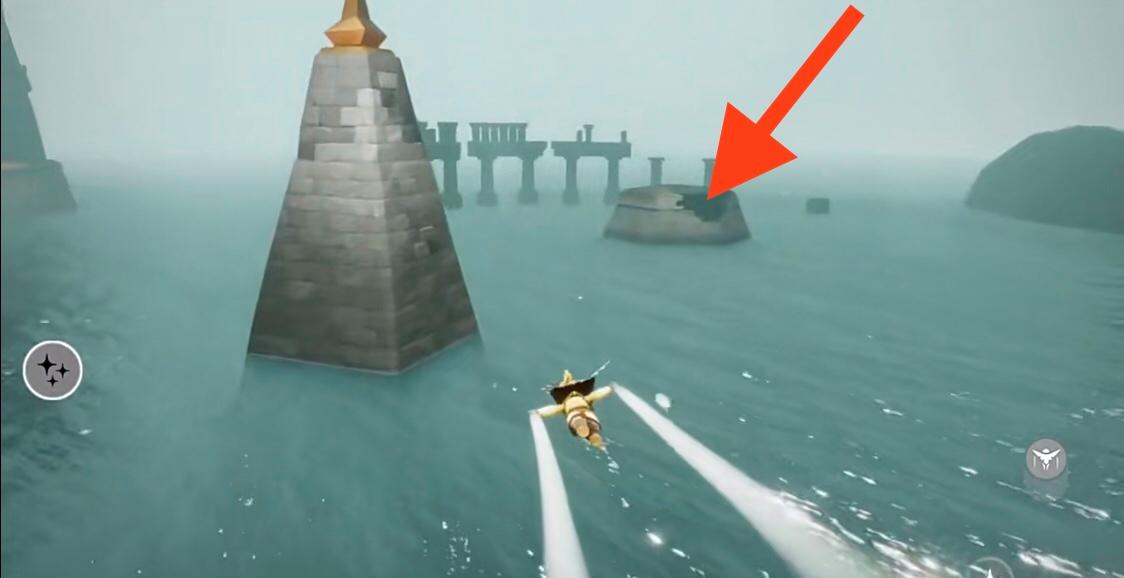1、首先在向导先祖那里领取第三个任务,领取完任务之后向前飞,会看到圆形的像井并且会有缺口的建筑物,从这个建筑物缺口潜水进入海中。