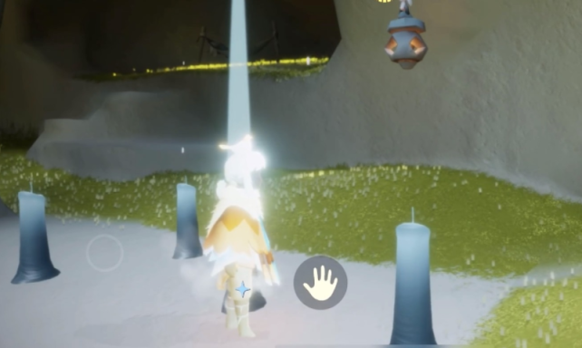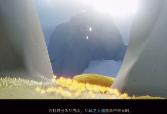 2.玩家当看到上面有长条光柱地时候,走过去就可以把蜡烛拿起来,这里也会有相应地动画提示我们要去地地点,第一个地点是需要玩家们去向导所在地山洞,玩家飞到侧面小岛地山洞里面,走到光柱地位置就可以了,接下来回到主岛拿第二个蜡烛,同样地找到我们需要去的地方,找到光柱放下来就可以完成啦;