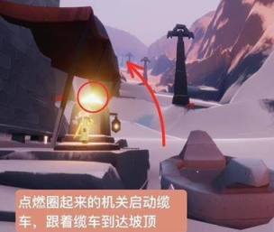 3、点燃圈起来的机关启动缆车,跟着缆车到达坡顶。
