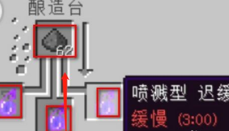 4.制作喷溅型药水,材料:特效药水、火药,在酿造台,放入刚刚得到的三瓶特效药水,在最上面一格放入火药,一段时间之后就可以获得喷溅型药水了。
