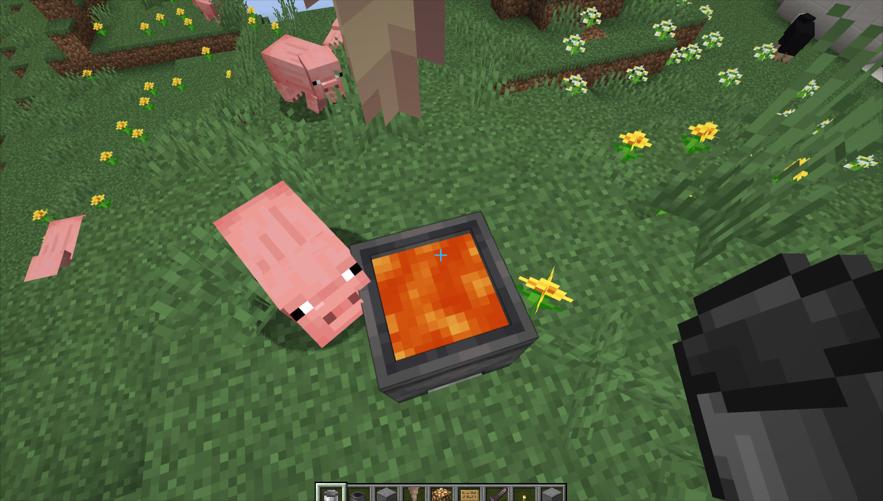 7、这时可以发现已经开始漏岩浆了。等待漏满一锅岩浆,就可以直接用桶把岩浆装走。