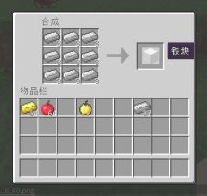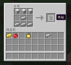 3、然后我们需要合成附魔用的铁砧。在工作台中按如图所示放置铁锭合成铁块。然后再用铁块和铁锭按如图所示方式合成铁砧。