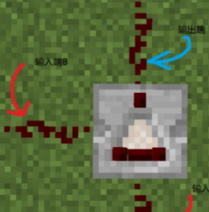 1.红石比较器一共有两个输入端。这两个输入端分别为红石比较器的后面以及红石比较器的侧面。我们姑且把后面的输入端命名为A、侧面为B。还有一个输出端,我们命名为C。