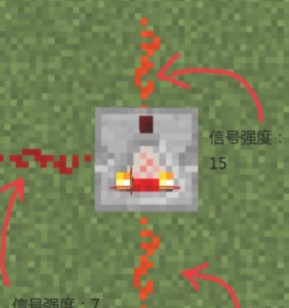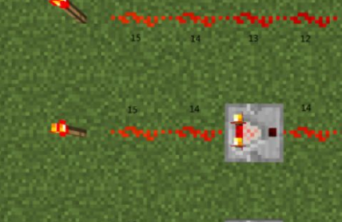 2.在没有输入端B时,红石比较器会传输输入端A的信号。不会中继、亦不会衰减。既没有中继器也没有比较器的电路,信号强度是正常衰减的,即从15以此向下衰减。在中继器的电路中,强度为14的信号被中继到15。在比较器的电路中,强度为14的信号经过比较器之后,仍然为14,没有任何变化。