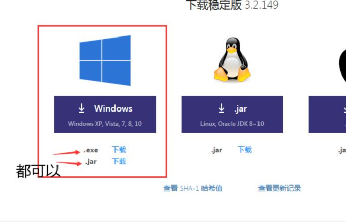 3、点击进入后,选择exe或jar下载都可以,然后等待自动下载完毕就可以了。