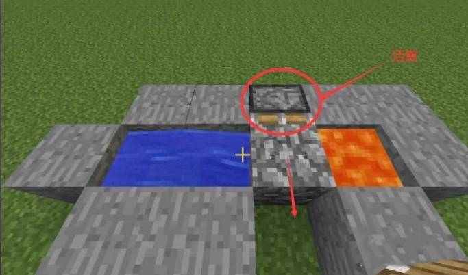 1.制作刷石机,我们是通过水和岩浆能够生成石头的原理进行制作,首先我们如图所示,摆放好石块。