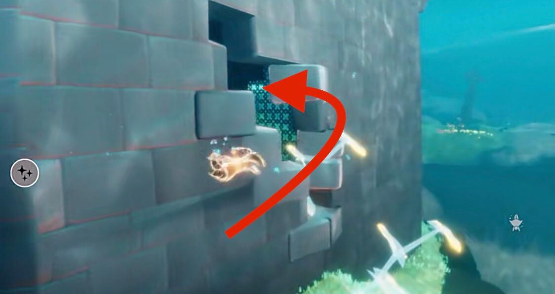 3、进入海里之后,就可以看到尖塔在海中的部分,围绕塔的墙壁可以寻找到一处墙壁有缺口,从缺口进入到这座塔中。