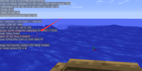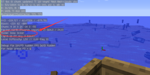 3、找到大海之后,要知道,一般海底神殿都是在深海区,按键盘上的F3弹出一个很多数字的界面,找到Biome:Deep Ocean就表示是深海区了。