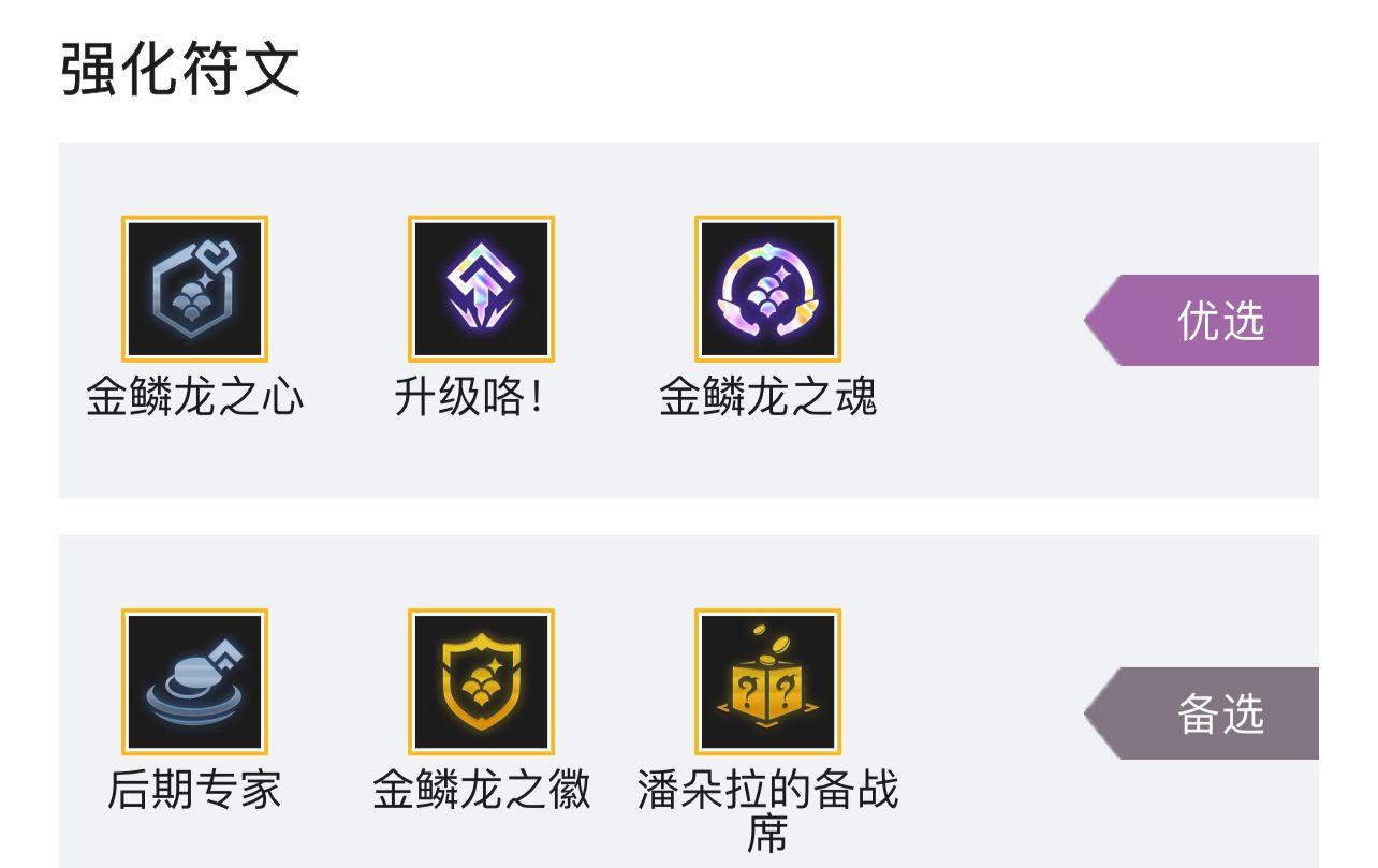 2、强化符文优选金鳞龙之心、升级咯、金鳞龙之魂,备选后期专家、金鳞龙之徽、潘多拉的备战席。