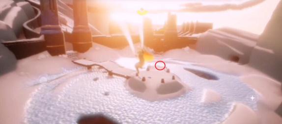 在峡谷有个冰湖的地图上,然后往如图所示的位置观察,其中有个亭子,然后需要飞到如图所示的位置,在这个半山腰上,就可以有一个先祖。激活之后跟随他,之后就可以得到这个动作。
