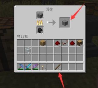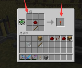 3、收集好这些材料后,在工作台上木棍 红石合成出红石火把,至少做两个红石火把。