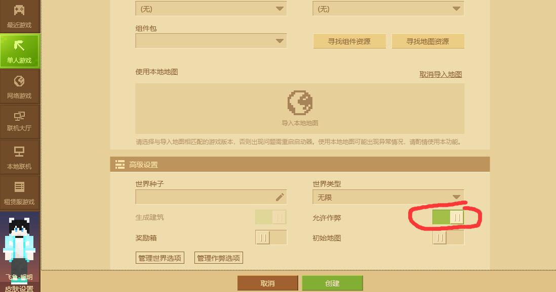 2,接着我们往下滑动,找到允许作弊,打开这个按钮就可以开启作弊码了。