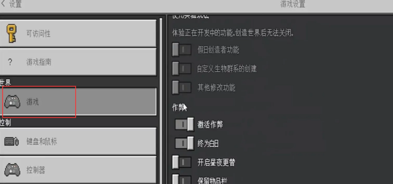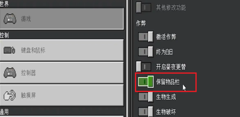 4.找到”保留物品栏“将其开启;当开启了保留物品栏之后,死亡的时候就不会掉落物品。