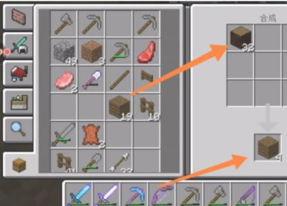3.橡木砍伐好了之后,我们点击工作台,首先将橡木块变为橡木板,再将橡木板变为木棍,