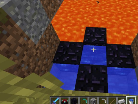 8.将水倒在岩浆上就能够生成黑曜石,最后使用钻石镐挖取黑耀石即可。