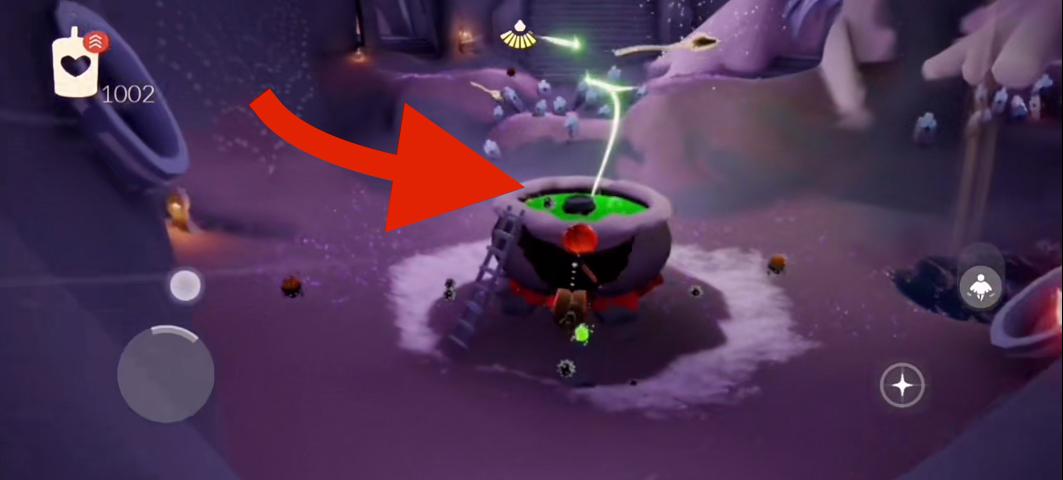 3、进入到万圣节地图之后,会看到一个熬制绿色水的大锅,在这个大锅的上面,漂浮着很多的绿色光球,这就是可以挂机收的烛火,在锅上挂机就可以收了。