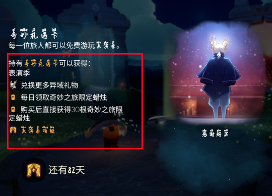 1.玩家持有奇妙礼遇卡可以获得:兑换更多异域礼物、每日领取奇妙之旅限定蜡烛,购买后直接获得30根奇妙之旅限定蜡烛,表演季项链。