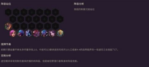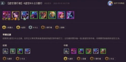 前期用2虚空2斗士过度,无尽正义等优秀装备直接给虚空掠夺者打工,记住多备一张2星虚空掠夺者。