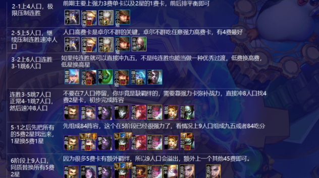 七,6阶段上9人口,t因为很多5费卡有额外羁绊,t所以9人口会溢出,额外上一个其他45费即可,同质替换所有5费2星2-1上4人口,极前期主要上强力3费单卡以及2星的1费卡,前后排平衡即可限压制连胜