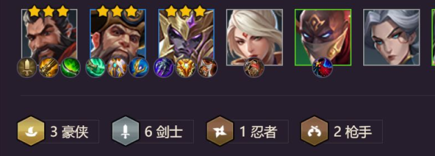1.男枪 地火霸主 轩辕 华剑战姬 海上幽影 青钢影 御界守,阵容羁绊:6剑士 3豪侠 2抢手 1忍者