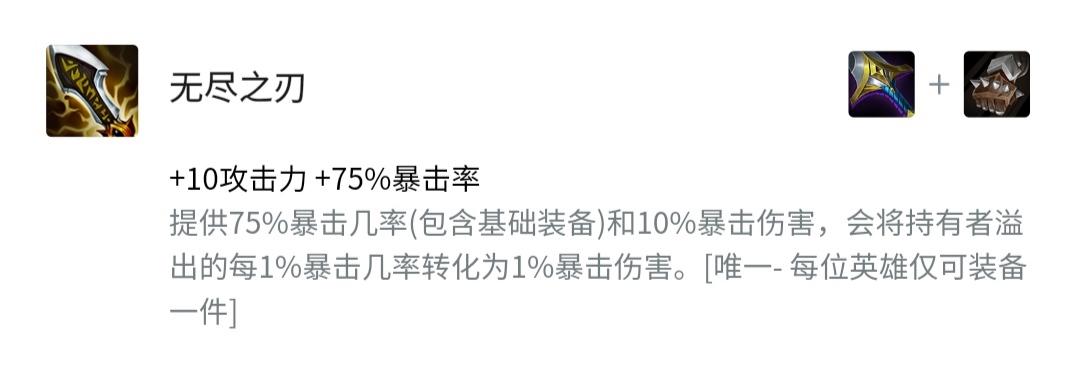 1.金铲铲之战赛娜作为输出的出装为无尽之刃,由大剑和拳套合成,提供75%的暴击率和10%暴击伤害。