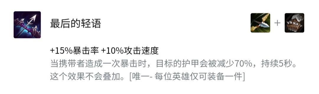 2.第二件装备是最后的轻语,由反曲弓和拳套合成。当携带者暴击时会削弱目标70%的护甲。