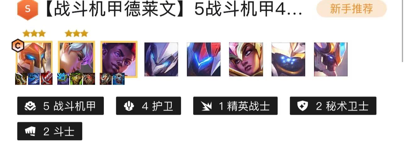 在金铲铲之战S8赛季中,战斗机甲有两种玩法,第一种玩法阵容是由德莱文、锐雯、艾克、瑟提、蕾欧娜、苪尔、贾克斯、孙悟空组成,羁绊是由5战斗机甲、4护甲、1精英战士、2秘术卫士、2斗士组成。