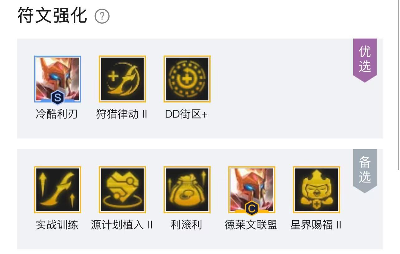 符文强化优选冷酷利刃、狩猎律动2、DD街区 ,备选实战训练、源计划植入2、利滚利、德莱文联盟、星界赐福2