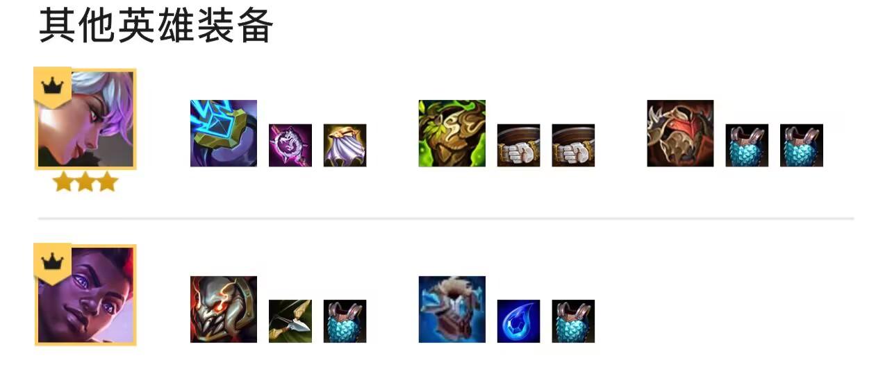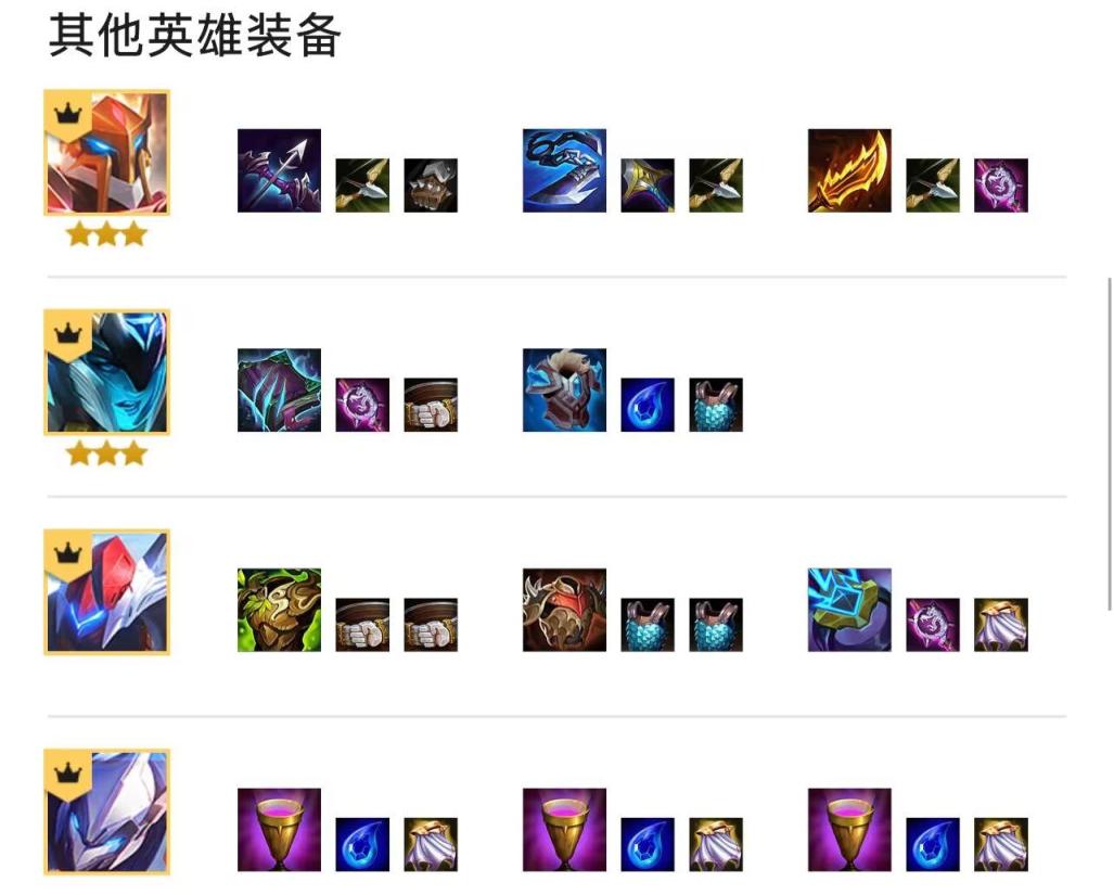其他英雄装备:德莱文的装备是轻语、巨杀、羊刀,瑟庄妮的装备是鬼书、冰心,蕾欧娜的装备是狂徒、荆棘背心、离子火花,瑟提的装备是3个圣杯。