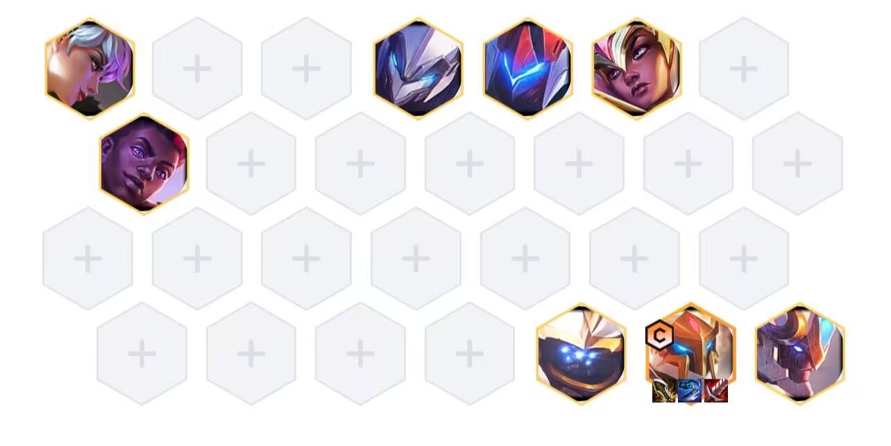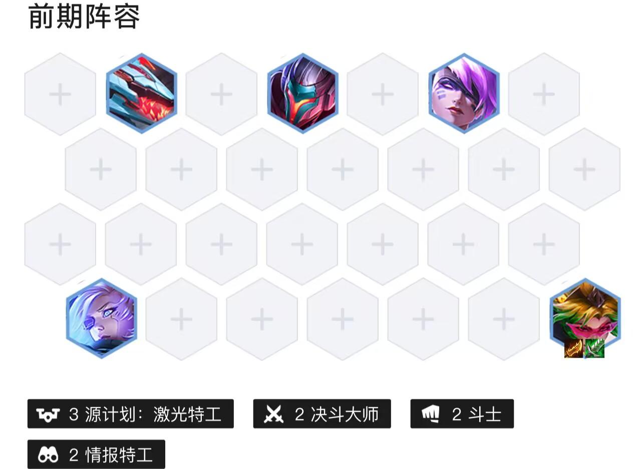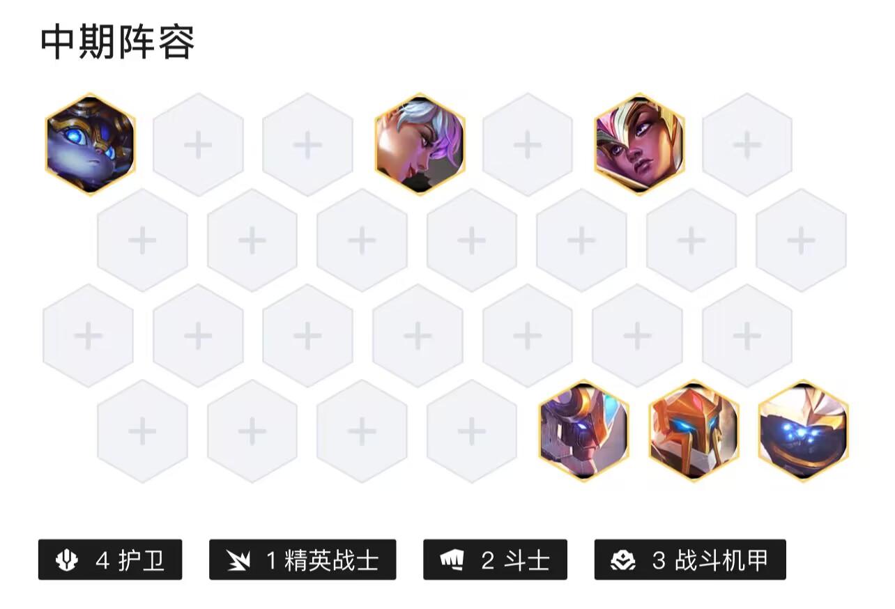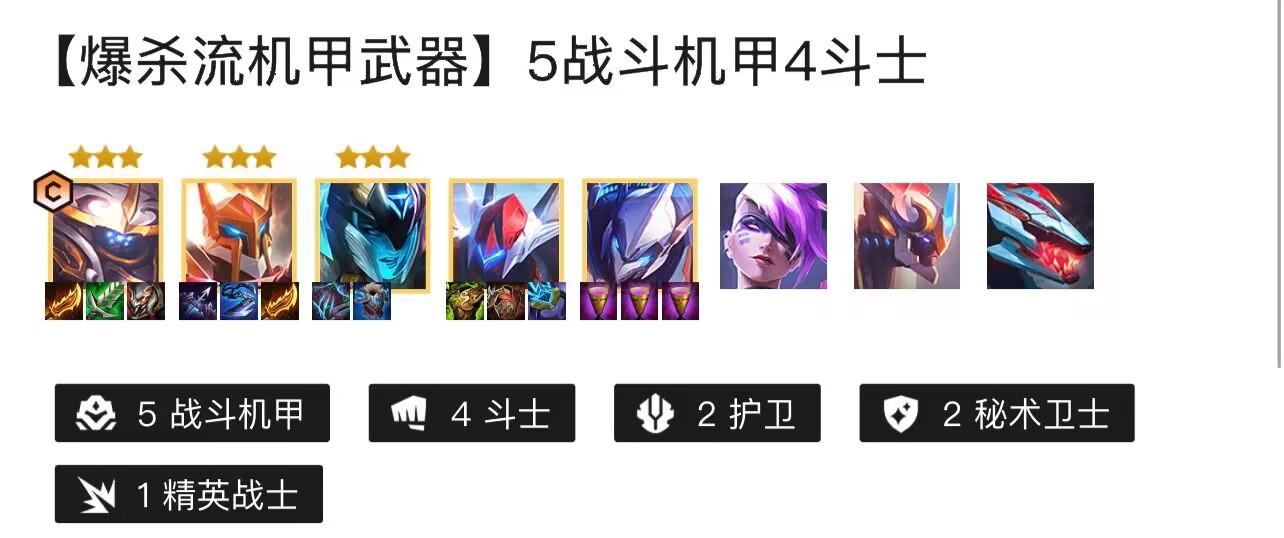 另一种战斗机甲玩法阵容是由贾克斯、德莱文、瑟庄妮、蕾欧娜、瑟提、蔚、孙悟空、雷克顿组成,羁绊是由5战斗机甲、4斗士、2护卫、2秘术卫士、1精英战士组成。