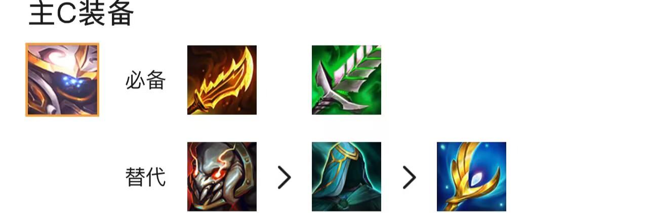 主C贾克斯的必备装备是羊刀、汲取剑,替代装备是泰坦的坚决、水银、大天使。