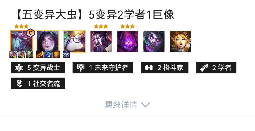 2.【五变异大虫】阵容:虚空恐惧-科加斯,虚空之女-卡莎,魔法猫咪-悠米,正义巨像-加里奥,虚空先知-玛尔扎哈,祖安狂人-蒙多,风暴之怒-迦娜。