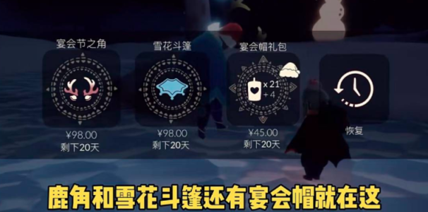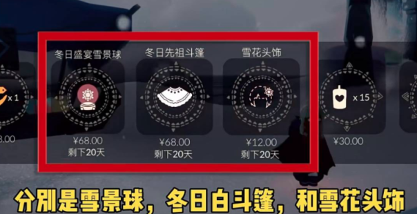 3、在遇境右上角设置商店中,可以购买获得盛宴雪景球,白色的冬日斗篷,和美丽的雪花头饰。