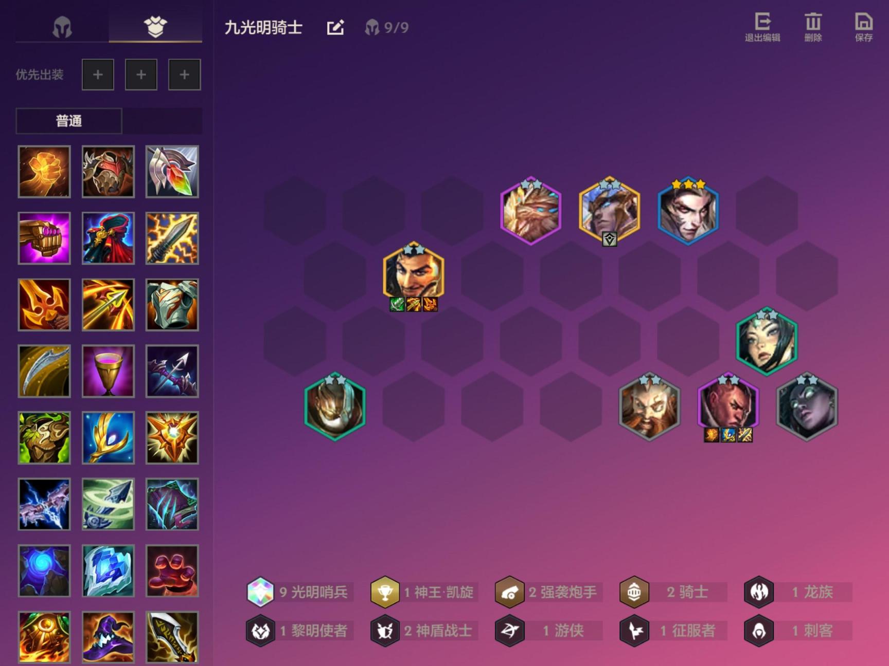 2.九光明骑士。这个阵容属于娱乐阵容,一般凑到这个阵容,基本上就可以稳拿第一。这个阵容需要九人口。而且还要有一个光明哨兵的转职书,这个阵容的牌,也不需要其他牌,我们只需要拿光明哨兵的牌即可。后期上盖伦给他光明转职书。装备推荐:卢锡安,法爆,正义之手,电刀。阿克尚,饮血剑,分裂弓,杀人剑。盖伦,光明哨兵转职书。