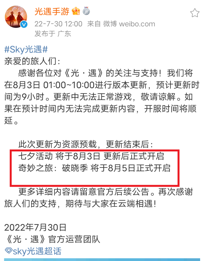 国服破晓季(有人也叫做破碎季)将在8月5日上线。根据官方通知,首先在8月3日将会进行9个小时的更新,更新内容就是资源的预载,更新结束之后,七夕活动就会在8月3日开启,随之破晓季(破碎季)的奇妙之旅也将要在8月5日正式开启了。