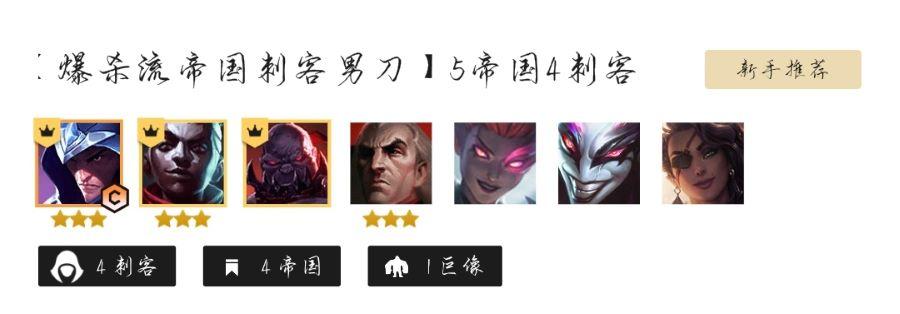 1、金铲铲之战目前最佳上分阵容为帝国刺客男刀,阵容由:男刀、艾克、塞恩、乌鸦、阿卡丽、小丑、莎弥拉组成,羁绊为:5帝国、4刺客、1巨像。