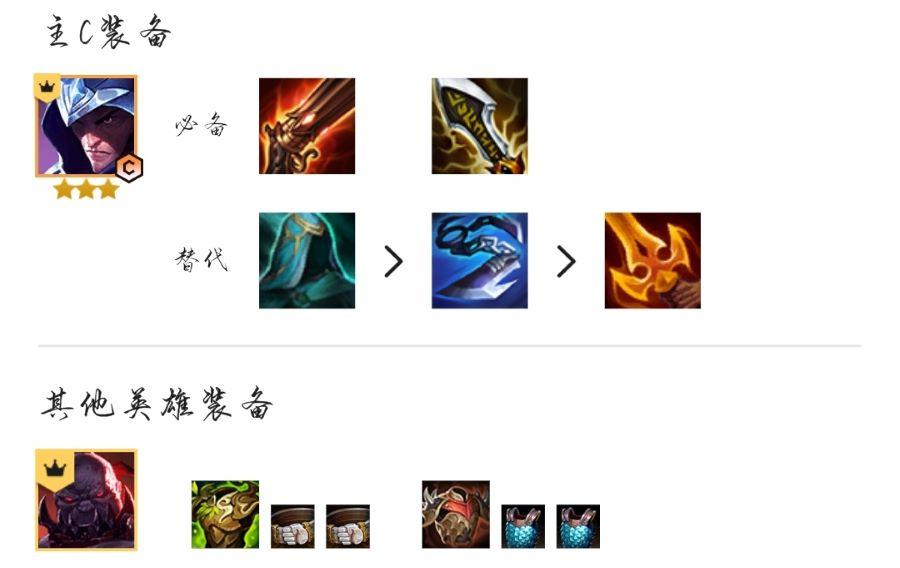 2、主要输出为男刀,必须装备为:火炮、无尽之刃,第三件装备为:水银、巨杀、杀人剑其中一个,肉装给到塞恩,需要的装备是:狂徒、反甲。