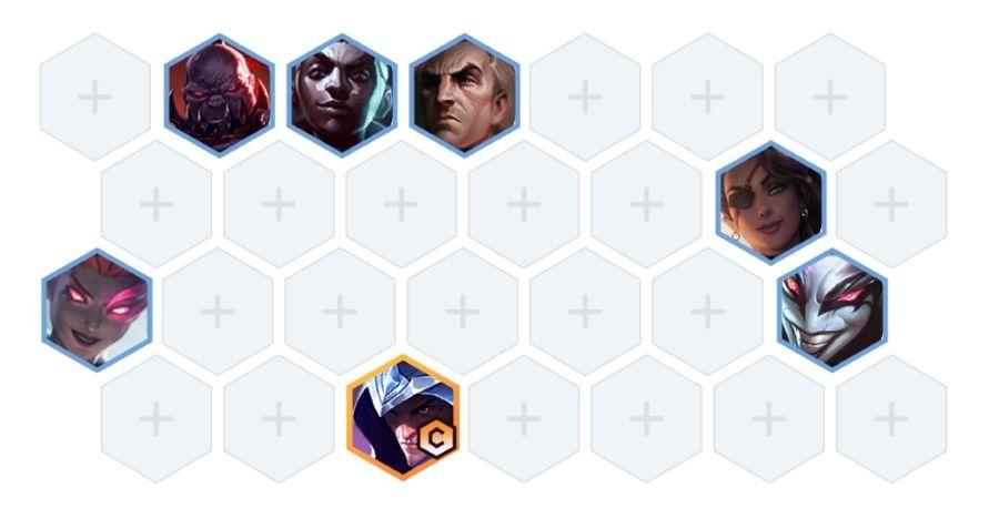 3、阵容站位为:塞恩、乌鸦、放在前排吃伤害,男刀放在艾克后边,其余刺客分开站位。
