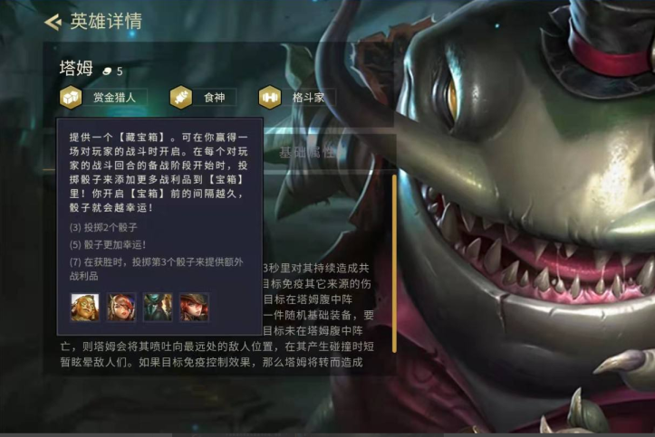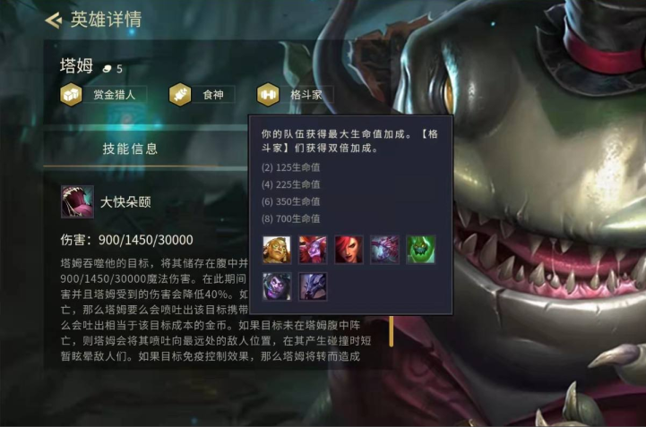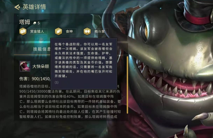 2.食神:在每个备战阶段,你可以用一名友军喂养一次塔姆。该友军会被吞噬但会永久将其攻击力、法术强度、生命值、护甲、或魔法抗性中的一项提供给塔姆,基于该英雄的类型及其金币价值。想要喂养塔姆的话,只需要将一名友军拖拽到塔姆处,并在他的嘴巴张开时松开按键。
