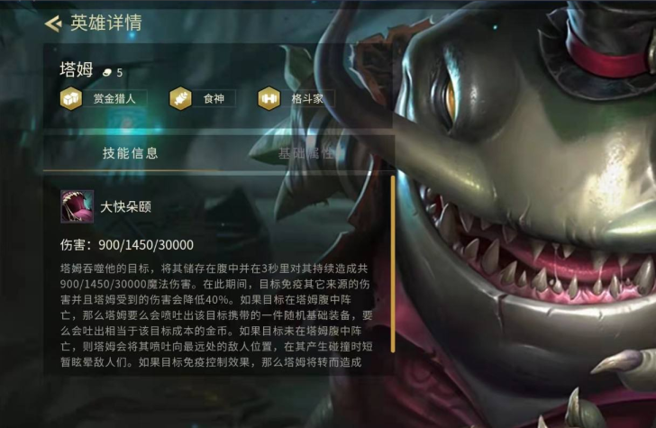 4.大快朵颐:塔姆肯奇吞噬他的目标,将它们储存在他的腹部,并在持续时间内造成魔法伤害。在此期间,他们不受到其他来源伤害,且塔姆肯奇受到的伤害降低40%。如果他们在塔姆肚子中死亡,塔姆会随机吐出他们持有的基础物品或成装组件,或者单位的金币成本。否则,他会将他们吐向最远的敌人,短暂地击晕他们撞击的目标。