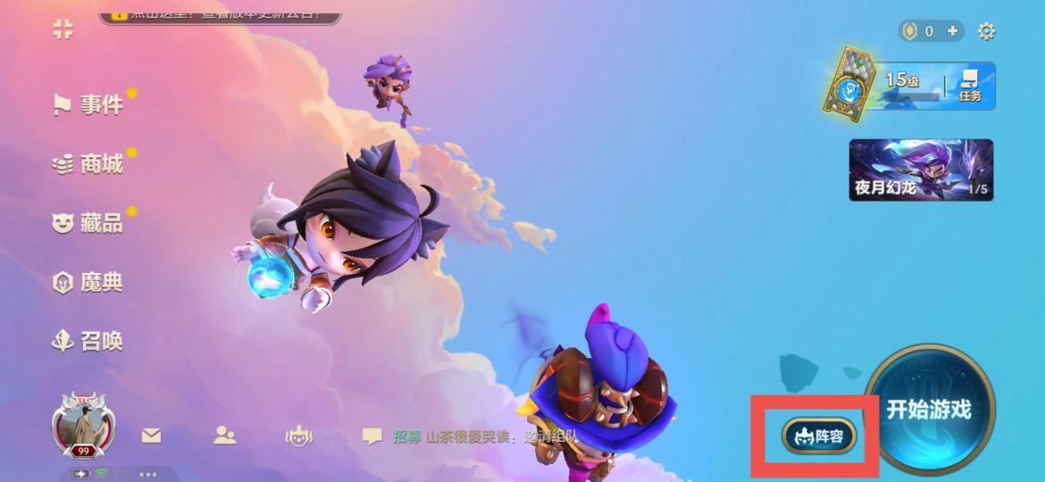 进入游戏界面后,点击右下角的阵容