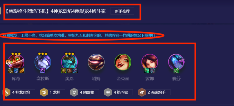③幽影格斗烈焰飞机。此阵容由库奇、塞拉斯、奥恩、塔姆、金克丝、娑娜、赛芬组成4神龙烈焰4幽影4格斗2强袭阵容。此阵容比较好成型,适合新手熟悉版本,主要输出为库奇(飞机),但害怕被刺客阵容切后排。