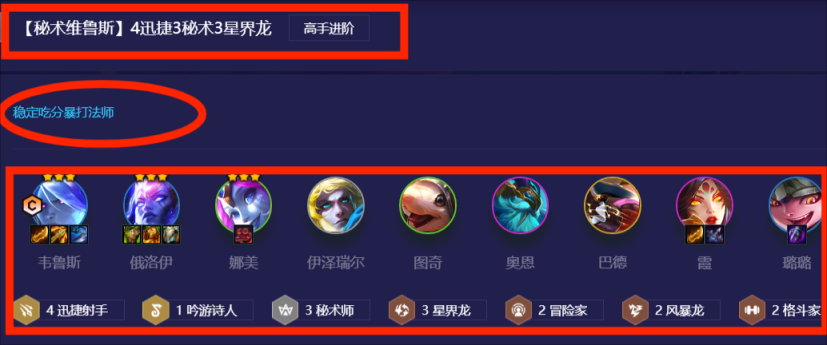 ③秘术韦鲁斯阵容。此阵容由韦鲁斯、俄洛伊、娜美、伊泽瑞尔、老鼠、奥恩、巴德、霞、璐璐组成4射手3秘术3星界龙阵容。前排俄洛伊追三星,坦度非常高,后排主要输出韦鲁斯在输出的同时还能提供大范围控制,这套阵容适合高手进阶或者变阵使用。
