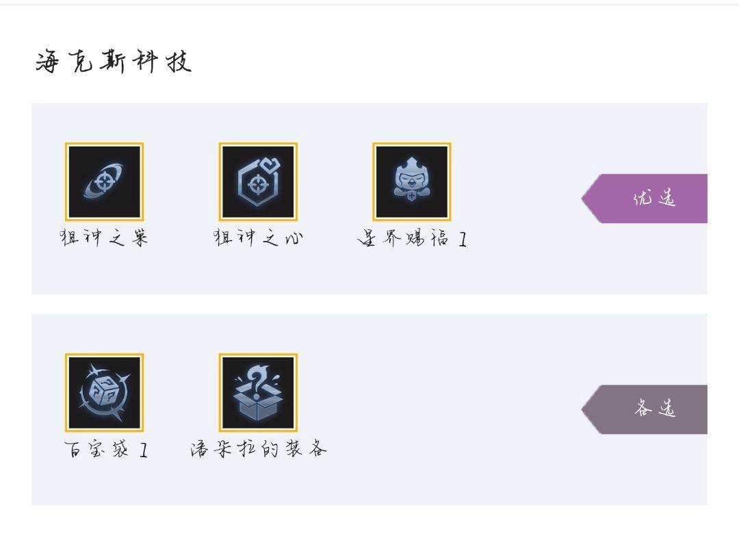 2.海克斯科技优选:狙神之巢,狙神之心,星界赐福I;备选:百宝袋I,潘多拉的装备。