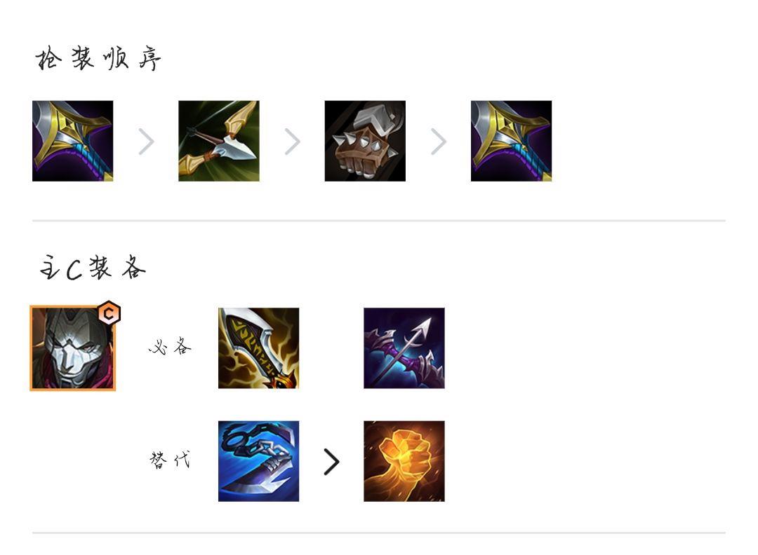 3.抢装顺序:暴风大剑>反曲之弓>拳击手套>暴风大剑。主C必备装备:无尽之刃,最后的轻语,第三件装备可以用巨人捕手或者用正义之手。